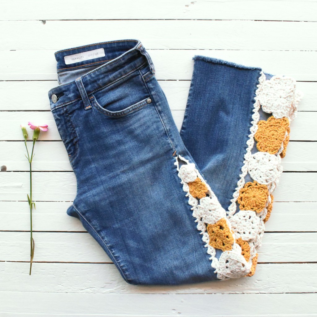 Jeans with a crocheted embellishment running down the outer seam, lying on a painted wood surface next to a flower.
